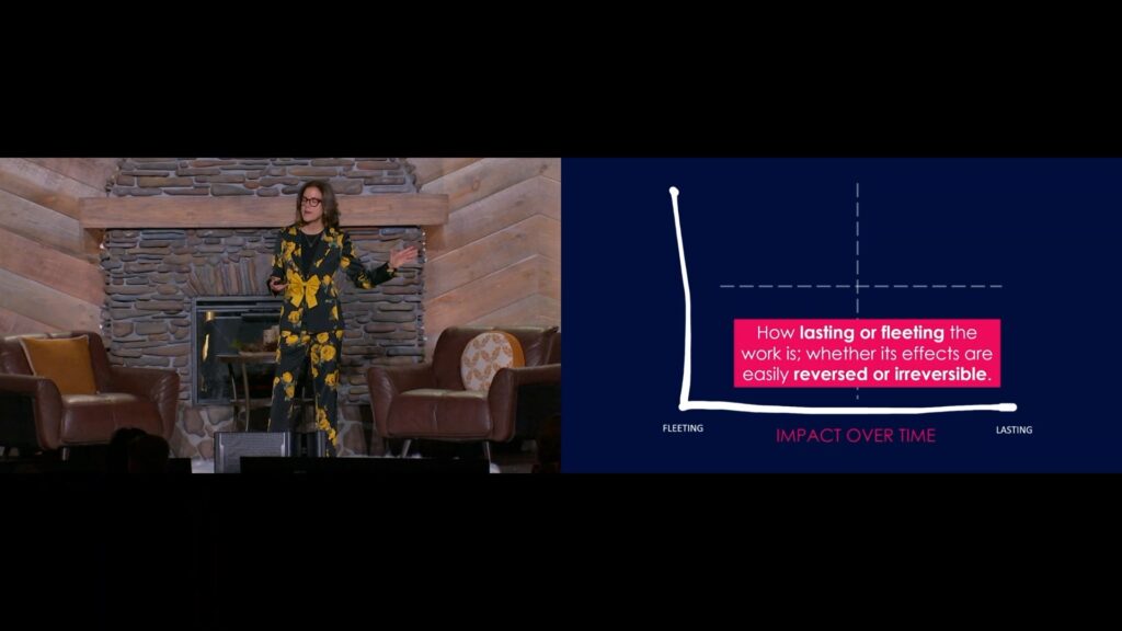 On one axis, we’re measuring impact over time. We’re measuring how lasting or fleeting the work is, the opportunity is, whether the effects are reversible or irreversible.