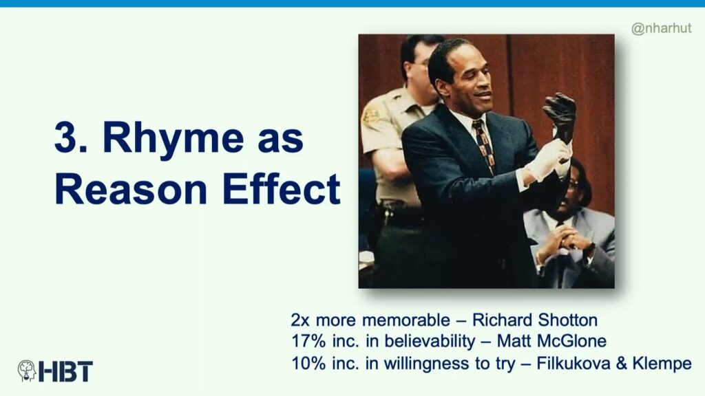 When phrases rhyme, people believe them more. They just sound more truthful. They sound more accurate. And as a result, they’re more believable. And if they’re more believable, we’re more likely to be persuaded by them, because we’re not going to be persuaded by information we don’t believe.