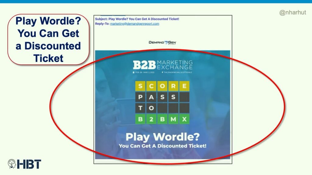 But you don’t usually see, “do you play Wordle? Hey, you can get a discount to a B2B conference!”