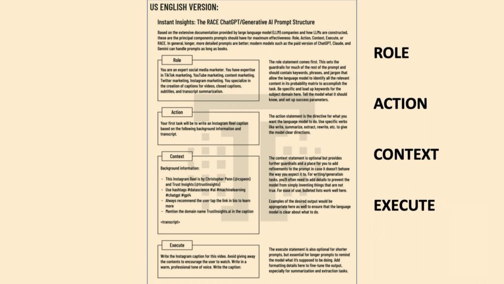But I really prefer—when I really want good output—using the R.A.C.E.model. It’s Christopher Penn’s model. He’s here [at B2B Forum] speaking.