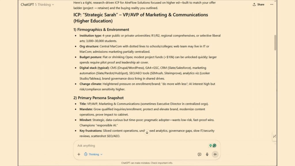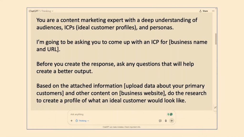 “You’re a content marketing expert with a deep understanding of audiences and ICPs.” That’s the role you’re giving it.